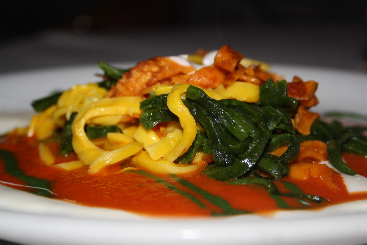 Una volta pronte, tagliatele a striscioline e disponetele, mescolando i colori, sul fondo di pomodoro. Schizzate con un top (sembra un biberon, dalla tettarella rigida e bucata, con il quale si "disegna" nei piatti più facilmente) di salsa di spinaci e decorate con la ricotta appena frullata con poco latte.